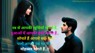 रब से आपकी खुशियाँ माँगते हैं, दुआओं में आपकी हंसी मांगते हैं.. सोचते हैं आपसे क्या मांगे, चलो आपसे उम्र भर की.. मोहब्बत मांगते हैं..!!