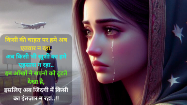 किसी की चाहत पर हमे अब एतवार न रहा, अब किसी भी ख़ुशी का हमे एहसास न रहा.. इन आँखों ने सपनो को टूटते देखा है, इसलिए अब जिंदगी में किसी का इंतज़ार न रहा..!!